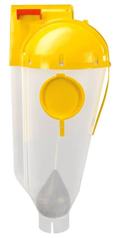 - Pear shaped feed release with two counter-weights.